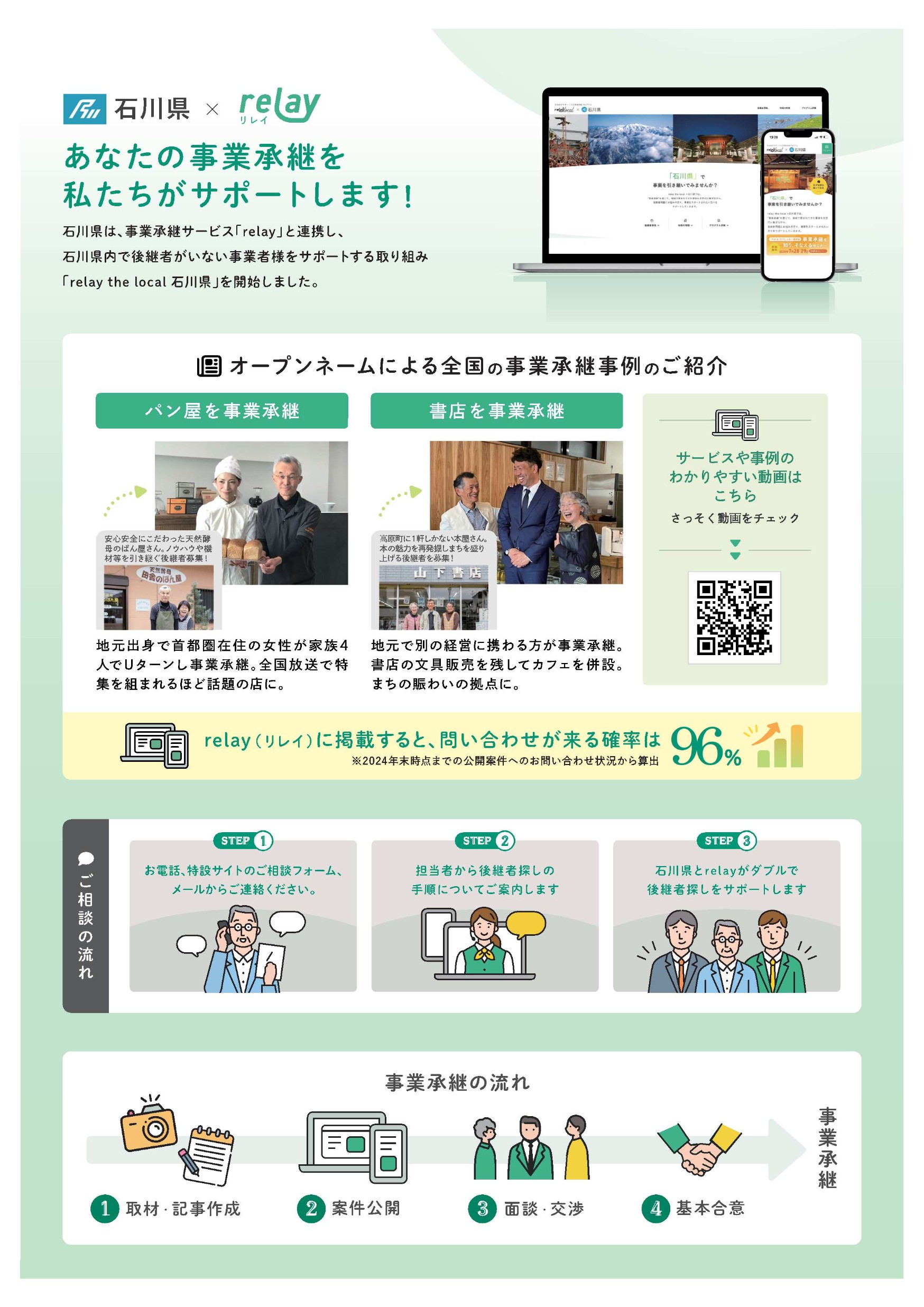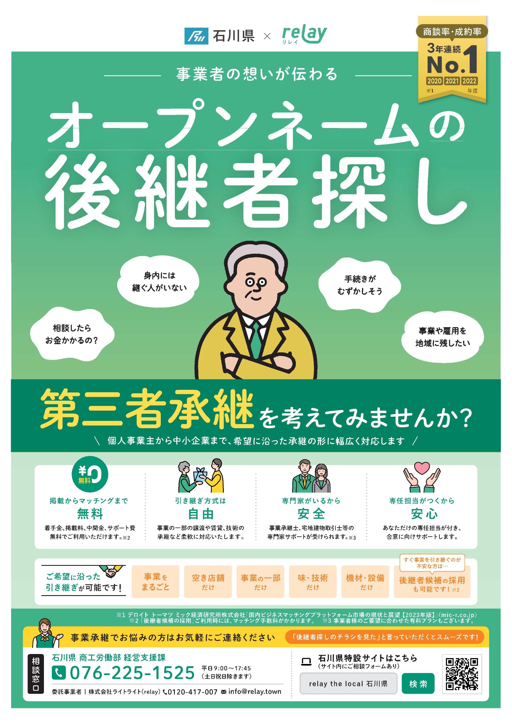 石川県は、事業承継サービス「relay」と連携し、石川県内で後継者がいない事業者様をサポートする取り組み「relay the local 石川県」を開始しました。