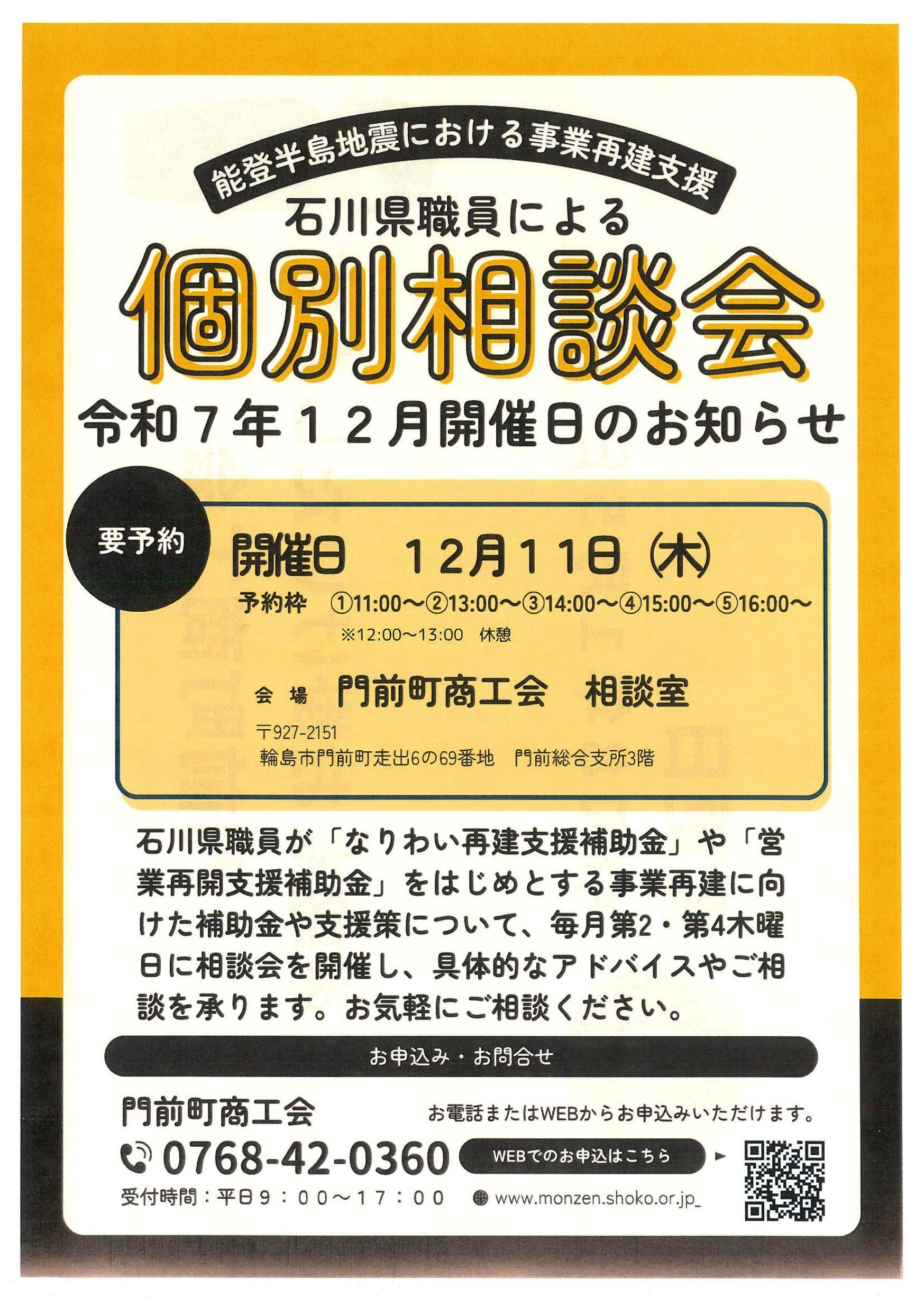 石川県職員による「なりわい再建支援補助金」や「営業再開支援補助金」を中心とした事業再建に向けた相談会を、下記のとおりに開催いたします。