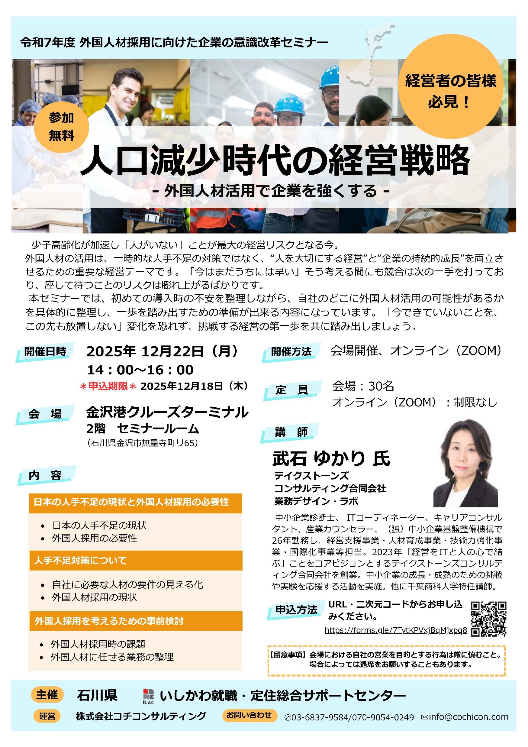 【いしかわ就職・定住総合サポートセンター セミナーのご案内】人口減少時代の経営戦略~外国人材活用で企業を強くする~