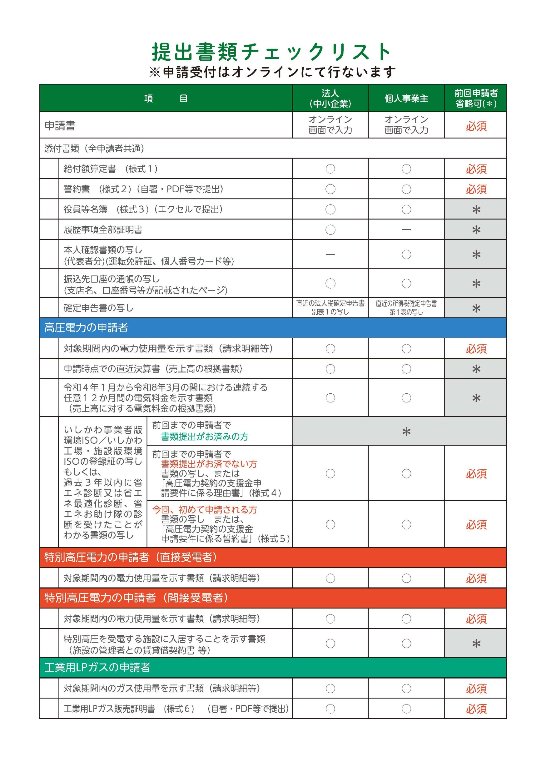 ---------- 申請受付期間:  令和8年4月15日(水)~6月15日(月) 高圧電力: 売上に対する電気代7%以上:1.2円/kwh(0.4円/kwh) 【上限40万円】 売上に対する電気代3.5%以上7%未満:0.6円/kwh(0.2円/kwh) 【上限20万円】 特別高圧:  1.3円/kwh(0.5円/kwh) 工業用LP:  7.0円/㎥(2.3円/㎥)  ※令和8年1~3月使用分が対象。()カッコ内は3月分支援単価 お問い合わせ先:  石川県電気・ガス価格高騰緊急対策支援金事務センター  076-231-3134(平日9時~18時) ----------